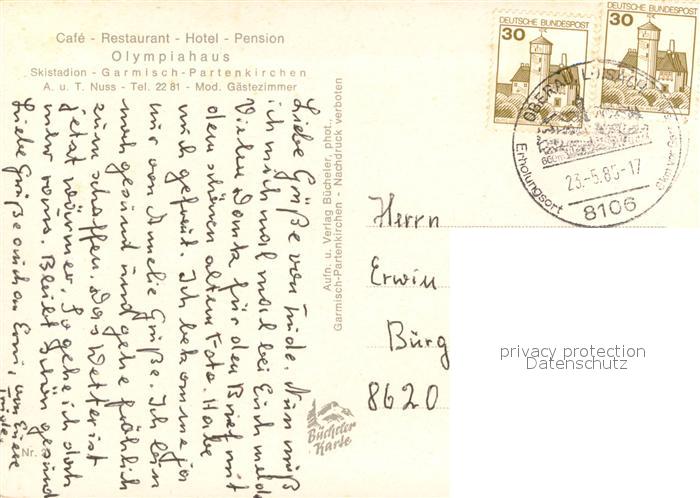 73720196 GARMISCH-PARTENKIRCHEN Bayern Cafe Restaurant Hotel Pension Olympiahaus Skistadion Alpen postalisch gelaufen Erhaltung siehe scans [FriedD77] alte Postkarte Frie Katcode 11110009180117