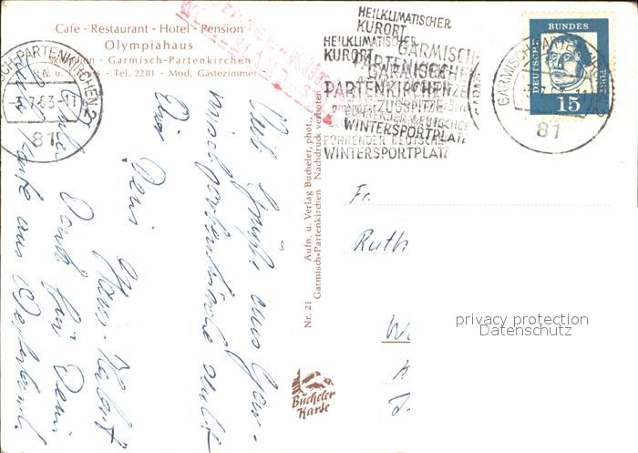 72525736 alte Postkarte GARMISCH-PARTENKIRCHEN Bayern Cafe Restaurant Olympiahaus Sprungschanze Skistadion postalisch gelaufen Erhaltung siehe scans KatCode: 11110009180117