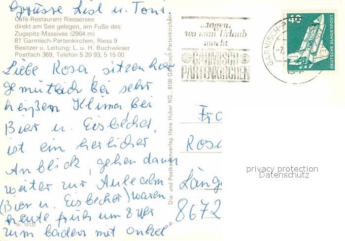 72783360 alte Postkarte GARMISCH-PARTENKIRCHEN Bayern Cafe Restaurant Riessersee am Fusse des Zugspitzmassiv Wettersteingebirge postalisch gelaufen Erhaltung siehe scans [FriedD77] KatCode: 11110009180117