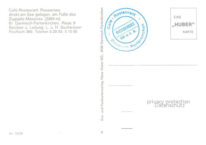 73650251 GARMISCH-PARTENKIRCHEN Bayern Cafe Restaurant Riessersee am Fusse des Zugspitzmassives Huber Karte Nr. 10106 postalisch nicht gelaufen Erhaltung siehe scans [FriedD77] KatCode: 11110009180117
