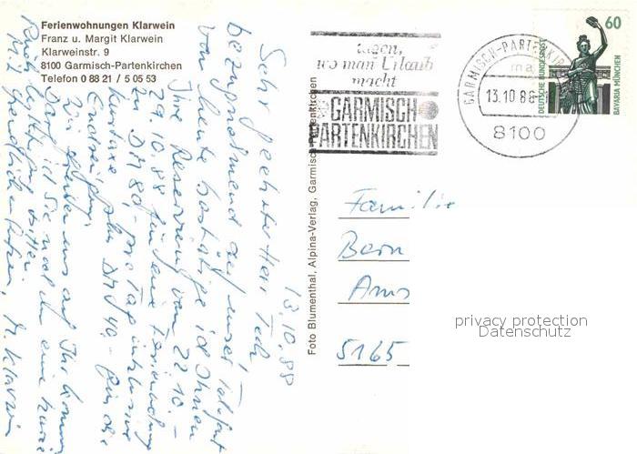 72818226 alte Postkarte GARMISCH-PARTENKIRCHEN Bayern Ferienwohnungen Klarwein postalisch gelaufen Erhaltung siehe scans [NatalD47] KatCode: 11110009180117