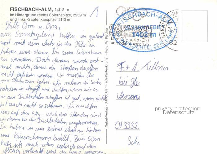 72884675 alte Postkarte GARMISCH-PARTENKIRCHEN Bayern Fischbach Alm mit Soiernspitze und Krapfenkarspitze postalisch gelaufen Erhaltung siehe scans [WerneD78] KatCode: 11110009180117