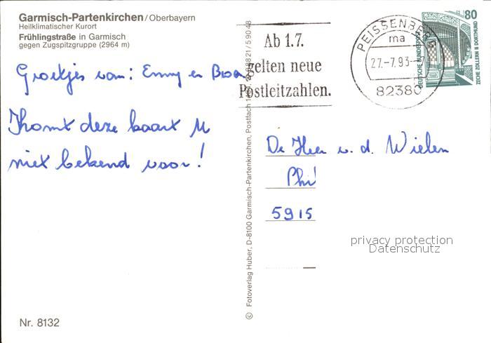 72449378 alte Postkarte GARMISCH-PARTENKIRCHEN Bayern Fruehlingsstrasse mit Zugspitzgruppe postalisch gelaufen Erhaltung siehe scans KatCode: 11110009180117