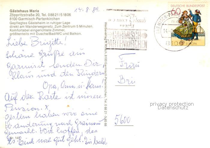73108013 alte Postkarte GARMISCH-PARTENKIRCHEN Bayern Gaestehaus Maria postalisch gelaufen Erhaltung siehe scans [KathaD81] KatCode: 11110009180117