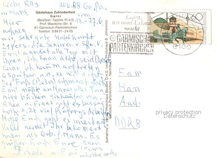 73785604 GARMISCH-PARTENKIRCHEN Bayern Gaestehaus Zufriedenheit Garni Aussenansicht postalisch gelaufen Erhaltung siehe scans [LiesaD40] alte Postkarte Lies Katcode 11110009180117