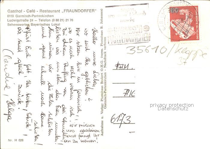 72129250 alte Postkarte GARMISCH-PARTENKIRCHEN Bayern Gasthof Restaurant Fraundorfer Fassadenmalerei postalisch gelaufen KatCode: 11110009180117