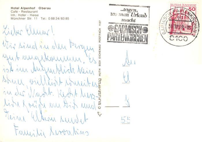 73906689 GARMISCH-PARTENKIRCHEN Bayern Hotel Alpenhof Oberau Cafe Restaurant postalisch gelaufen Erhaltung siehe scans [FriedD77] alte Postkarte Frie Katcode 11110009180117