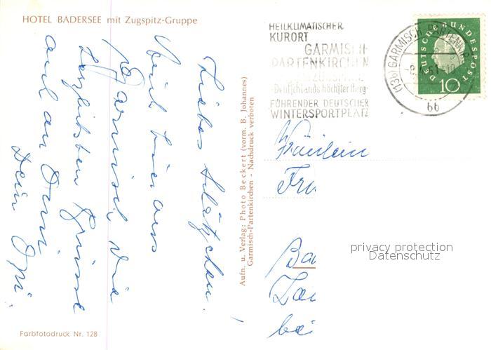 73041764 alte Postkarte GARMISCH-PARTENKIRCHEN Bayern Hotel Badersee mit Zugspitzgruppe postalisch gelaufen Erhaltung siehe scans [WerneD78] KatCode: 11110009180117