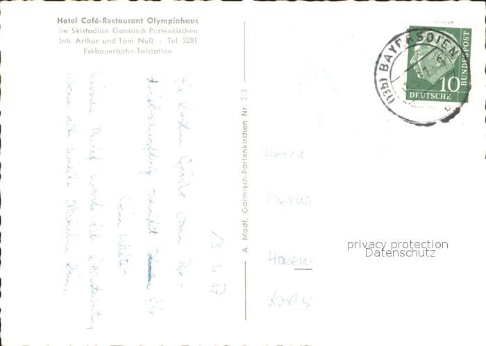 72093855 alte Postkarte GARMISCH-PARTENKIRCHEN Bayern Hotel Cafe Restaurant Olympiahaus postalisch gelaufen Erhaltung siehe scans KatCode: 11110009180117