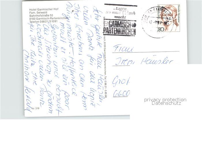 72533768 alte Postkarte GARMISCH-PARTENKIRCHEN Bayern Hotel Garmischer Hof postalisch gelaufen Erhaltung siehe scans [LiesaD40 kt094box] KatCode: 11110009180117
