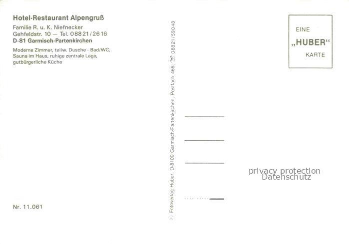 74040489 GARMISCH-PARTENKIRCHEN Bayern Hotel Restaurant Alpengruss Alpenblick Huber-Karte Nr. 11.061 postalisch nicht gelaufen Erhaltung siehe scans [FriedD77] Frie Katcode 11110009180117
