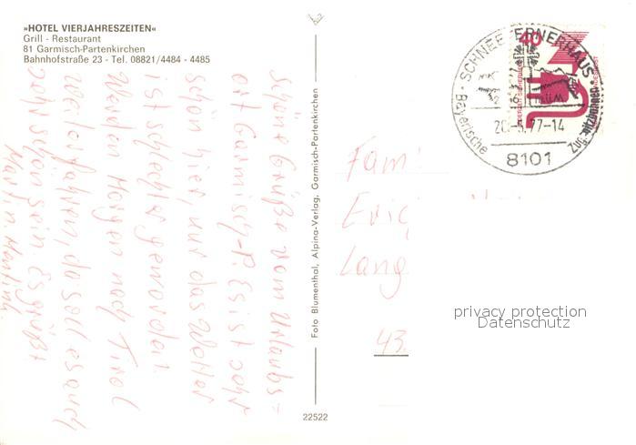 73211699 alte Postkarte GARMISCH-PARTENKIRCHEN Bayern Hotel Vierjahreszeiten Speisesaal Grill Restaurant postalisch gelaufen Erhaltung siehe scans [WerneD78] KatCode: 11110009180117