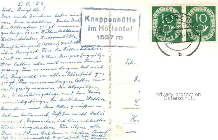 73282519 alte Postkarte GARMISCH-PARTENKIRCHEN Bayern Knappenhoeuser Hoellental Zugspitze postalisch gelaufen Erhaltung siehe scans [NatalD47] KatCode: 11110009180117