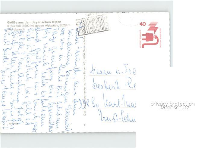 72330221 alte Postkarte GARMISCH-PARTENKIRCHEN Bayern Kreuzalm mit Alpspitze Nordwan postalisch gelaufen Erhaltung siehe scans KatCode: 11110009180117
