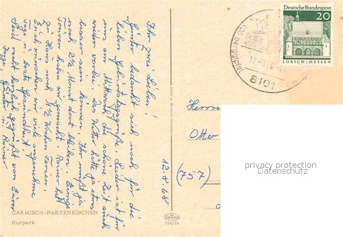 72867337 alte Postkarte GARMISCH-PARTENKIRCHEN Bayern Kurpark postalisch gelaufen Erhaltung siehe scans [NatalD47] KatCode: 11110009180117