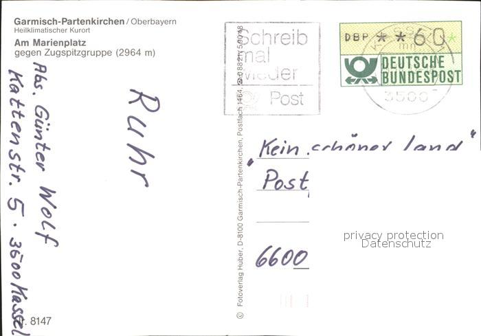 72142607 alte Postkarte GARMISCH-PARTENKIRCHEN Bayern Marienplatz mit Zugspitze postalisch gelaufen Erhaltung siehe scans KatCode: 11110009180117