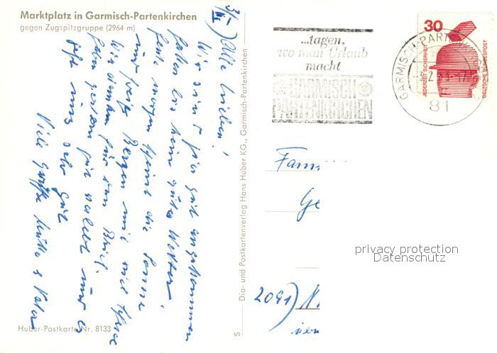73574436 alte Postkarte GARMISCH-PARTENKIRCHEN Bayern Marktplatz gegen Zugspitzgruppe Wettersteingebirge Winterimpressionen postalisch gelaufen Erhaltung siehe scans [FriedD77] KatCode: 11110009180117