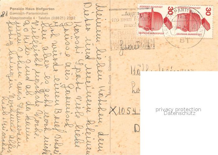 73719672 GARMISCH-PARTENKIRCHEN Bayern Pension Haus Hofgarten postalisch gelaufen Erhaltung siehe scans [WerneD78] alte Postkarte Wern Katcode 11110009180117