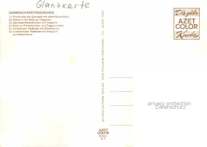 72616539 GARMISCH-PARTENKIRCHEN Bayern Pfarrkirche Bauernhaus Posthorn Alpspitze Zugspitze Riessersee Waxensteine Glanzkarte postalisch nicht gelaufen Erhaltung siehe scans [FriedD77] KatCode: 11110009180117
