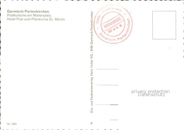 72414199 GARMISCH-PARTENKIRCHEN Bayern Postkutsche Marienplatz Hotel Post Pfarrkirche St Martin postalisch nicht gelaufen Erhaltung siehe scans KatCode: 11110009180117