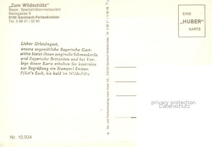 73323212 GARMISCH-PARTENKIRCHEN Bayern Restaurant Zum Wildschuetz Gesamtansicht mit Alpenpanorama Huber Karte Nr 10934 postalisch nicht gelaufen Erhaltung siehe scans [FriedD77] KatCode: 11110009180117