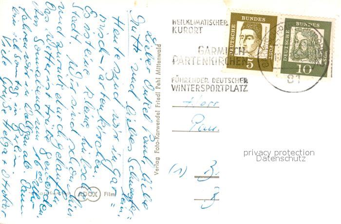43496257 GARMISCH-PARTENKIRCHEN Bayern Stadtbild mit Kirche Blick zur Alpspitze Hoellental und Zugspitze Wettersteingebirge postalisch gelaufen Erhaltung siehe scans [FriedD77] alte Postkarte Frie Katcode 11110009180117