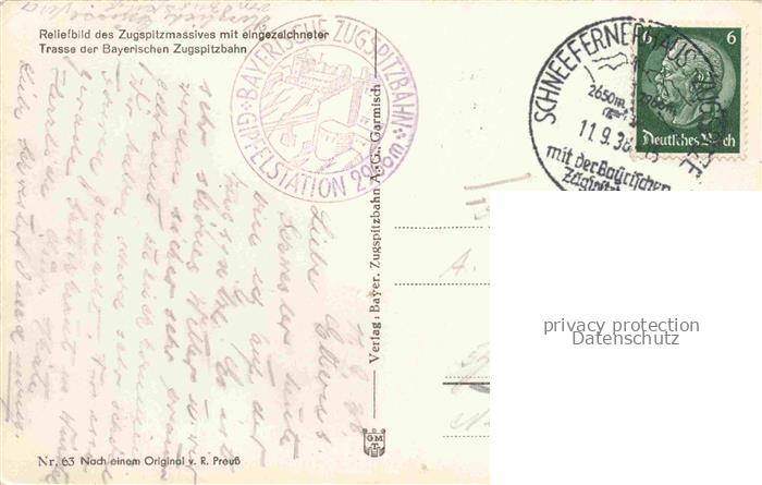 74037098 GARMISCH-PARTENKIRCHEN Bayern und Umgebung Reliefbild mit Zugspitzmassiv Trasse der Bayerischen Zugspitzbahn Kuenstlerkarte postalisch gelaufen Erhaltung siehe scans [FriedD77] alte Postkarte Frie Katcode 11110009180117