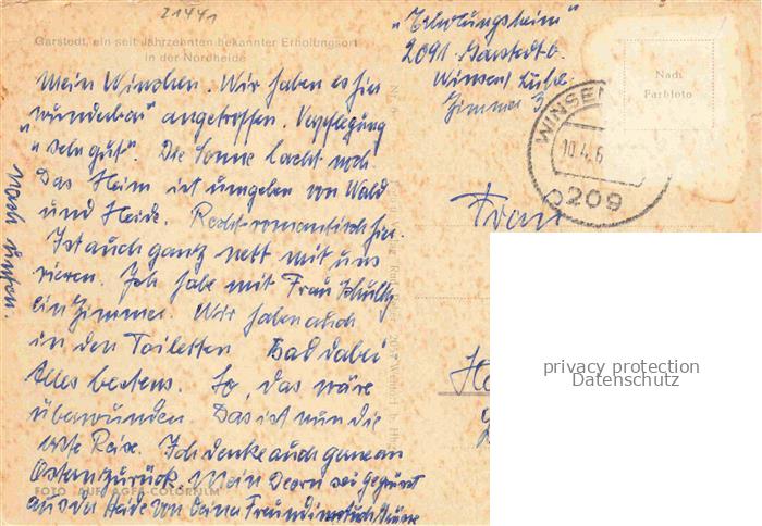 74026830 alte Postkarte Garstadt Erholungsort Nordheide Erholungsheim Schroeder-Stiftung Gastraum Terrasse postalisch gelaufen Erhaltung siehe scans [FriedD77] KatCode: 11110009678115