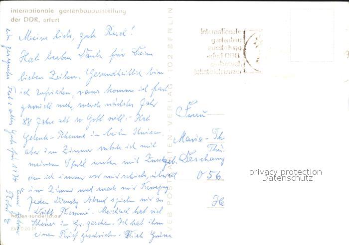 alte Postkarte Gartenbauaustellung Erfurt Hallen-Sonderschau postalisch gelaufen Erhaltung siehe scans