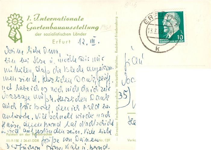 73930876 alte Postkarte Gartenbauaustellung Erfurt Palmen an der Wasserachse postalisch gelaufen Erhaltung siehe scans [IrynaD87] KatCode: 22100000000100