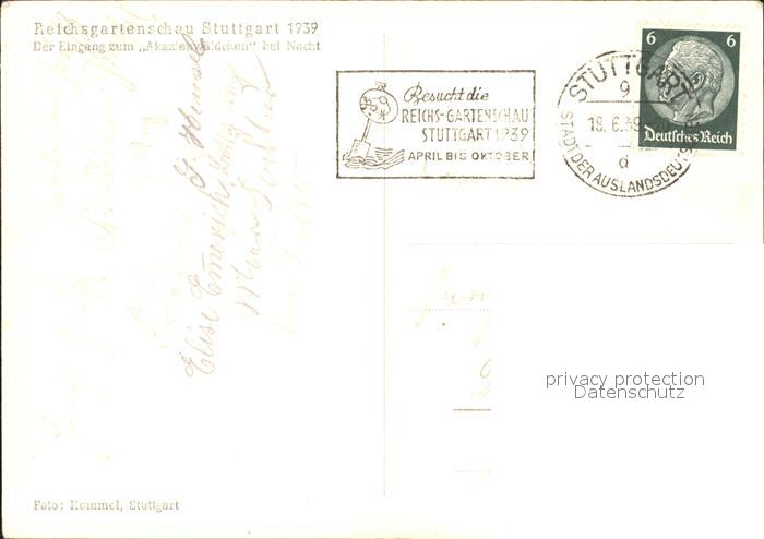 alte Postkarte Gartenschau Reichsgartenschau Stuttgart Eingang Akazienwaeldchen postalisch gelaufen Erhaltung siehe scans