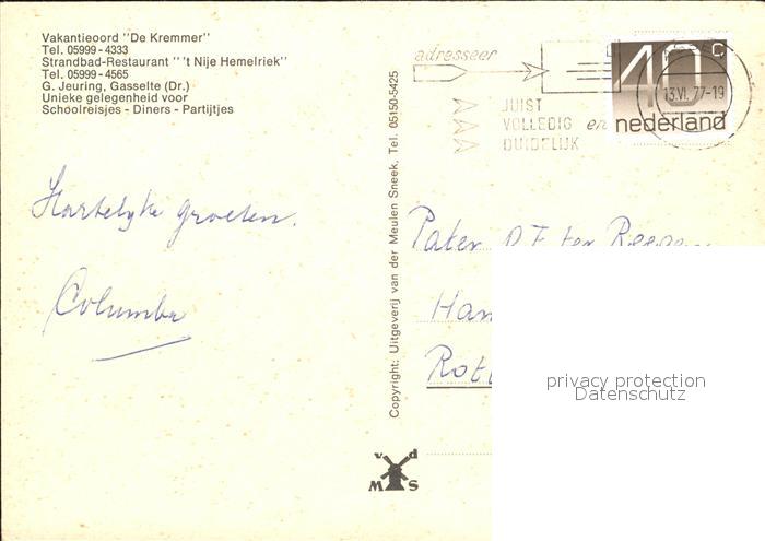 old postcard Gasselte Aa en Hunze Vakantieoord De Kremmer Strandbad Restaurant t Nije Hemelriek postalisch gelaufen Erhaltung siehe scans