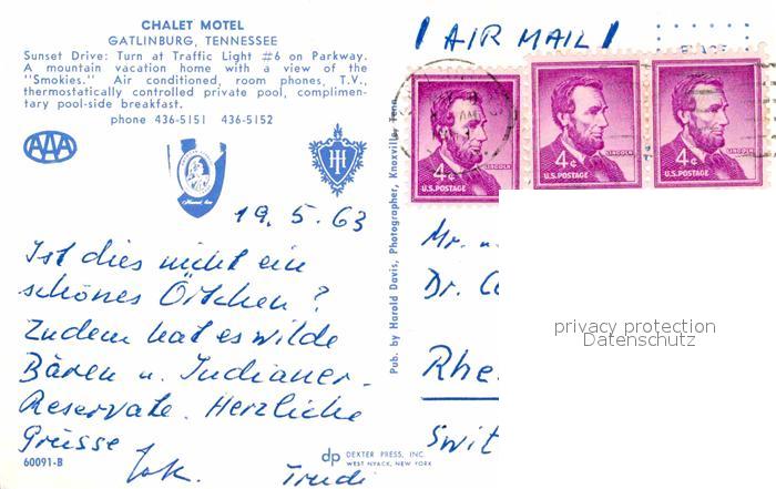 72763556 old postcard Gatlinburg Chalet Motel postalisch gelaufen Erhaltung siehe scans [LiesaD40] KatCode: 14140450000000