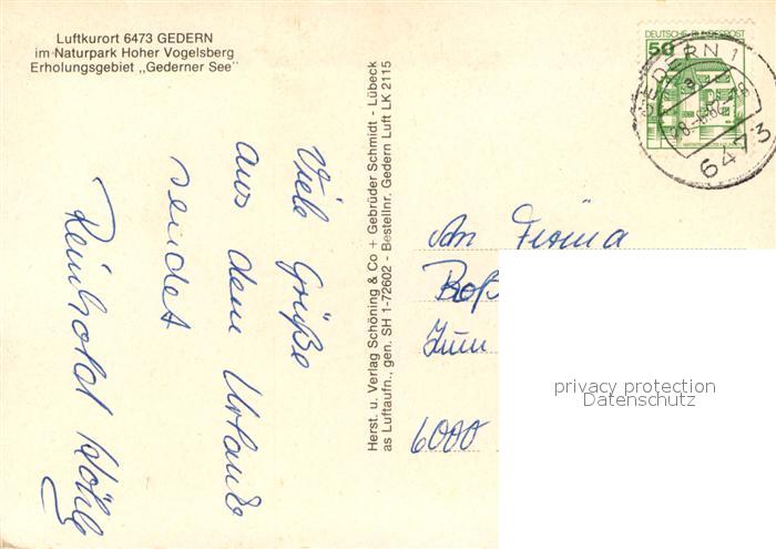 73126586 alte Postkarte Gedern Naturpark Hoher Vogelsberg Erholungsgebiet Gedener See Fliegeraufnahme postalisch gelaufen Erhaltung siehe scans [FriedD77] KatCode: 11110006440009