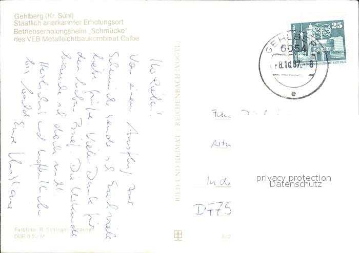 72470720 alte Postkarte Gehlberg Betriebserholungsheim Schmuecke VEB Metalleichtbaukombinat Calbe postalisch gelaufen Erhaltung siehe scans KatCode: 11110016070017
