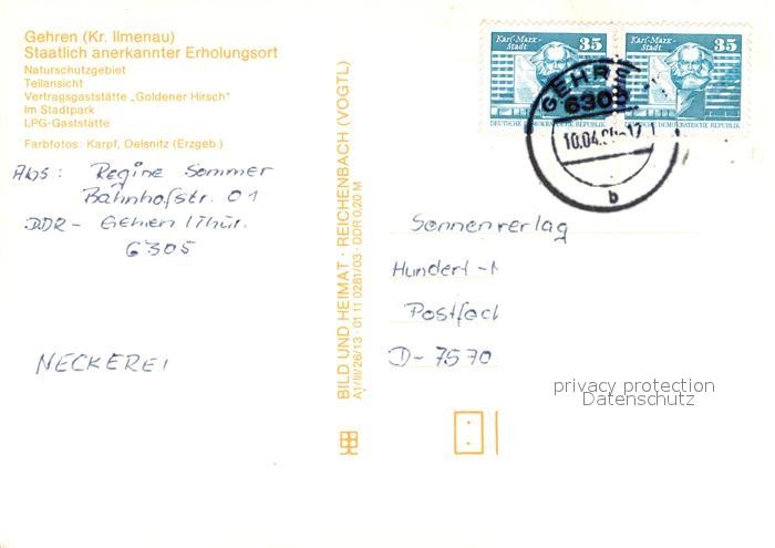 73661689 alte Postkarte Gehren Thueringen Naturschutzgebiet Teilansicht Gaststaette Goldener Hirsch Stadtpark LPG-Gaststaette postalisch gelaufen Erhaltung siehe scans [FriedD77] KatCode: 11110016070018