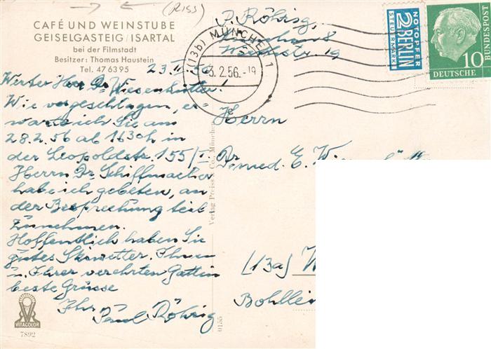 73872310 alte Postkarte Geiselgasteig Cafe und Weinstube postalisch gelaufen Erhaltung siehe scans [WerneD78] KatCode: 11110009184122