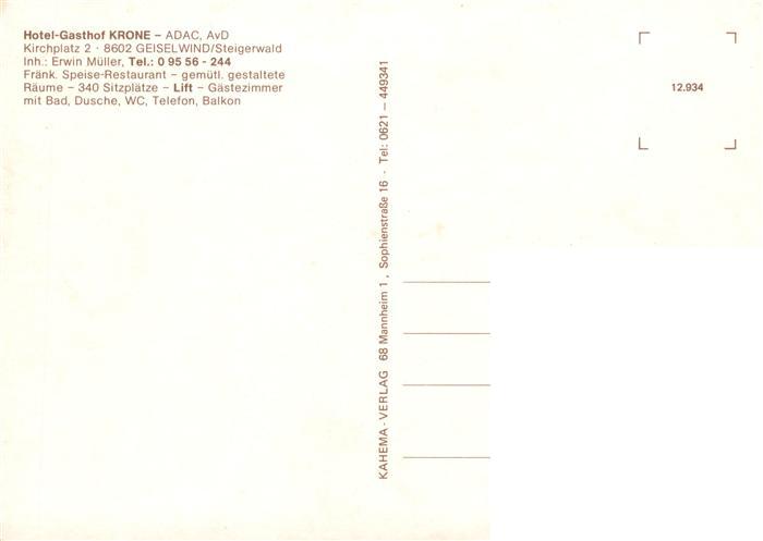 73896785 Geiselwind Hotel Gasthof Krone Gastraum Ortsansicht postalisch nicht gelaufen Erhaltung siehe scans [WerneD78] KatCode: 11110009675127