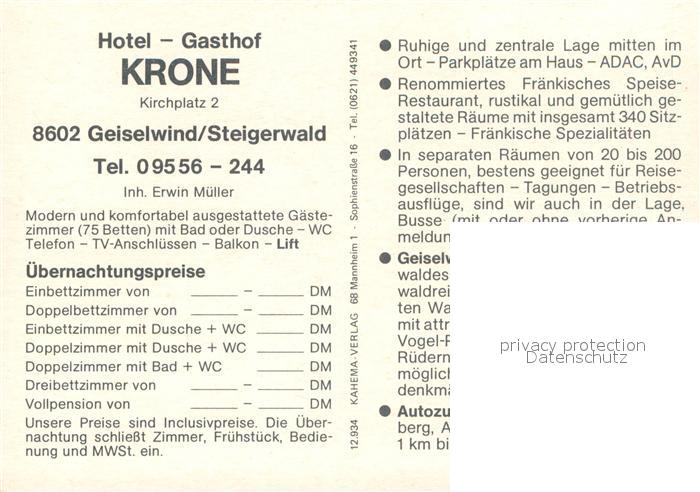 73715999 Geiselwind Hotel Gasthof Krone Panorama Gastraum postalisch nicht gelaufen Werbekarte (keine Postkarte) Erhaltung siehe scans [WerneD78] KatCode: 11110009675127