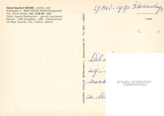 73654679 Geiselwind Hotel Gasthof Krone Restaurant Stadtpanorama postalisch nicht gelaufen Erhaltung siehe scans [FriedD77] KatCode: 11110009675127