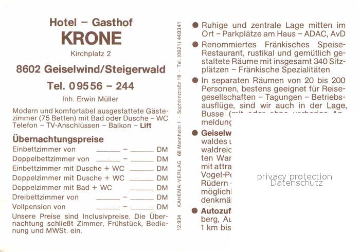 72855079 Geiselwind Hotel Krone Panorama postalisch nicht gelaufen Werbekarte (keine Postkarte) Erhaltung siehe scans [AndreD76] KatCode: 11110009675127