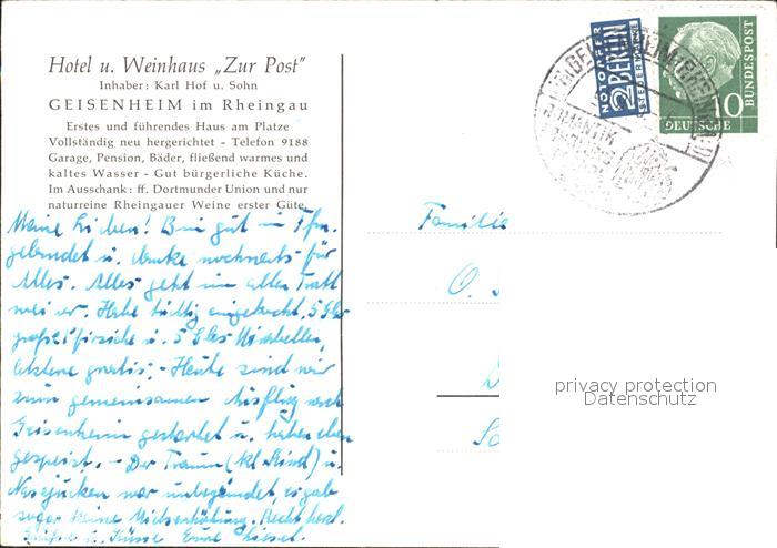 72095975 alte Postkarte Geisenheim Hotel Weinhaus Zur Post postalisch gelaufen Erhaltung siehe scans KatCode: 11110006439004