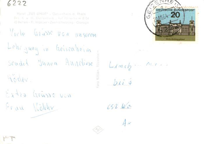 73869789 alte Postkarte Geisenheim Hotel zur Linde postalisch gelaufen Erhaltung siehe scans [FriedD77] KatCode: 11110006439004