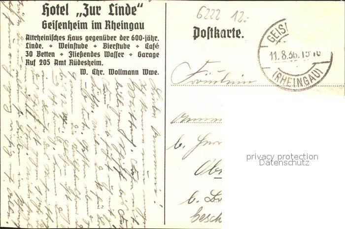 72095854 alte Postkarte Geisenheim Hotel zur Linde postalisch gelaufen Erhaltung siehe scans KatCode: 11110006439004