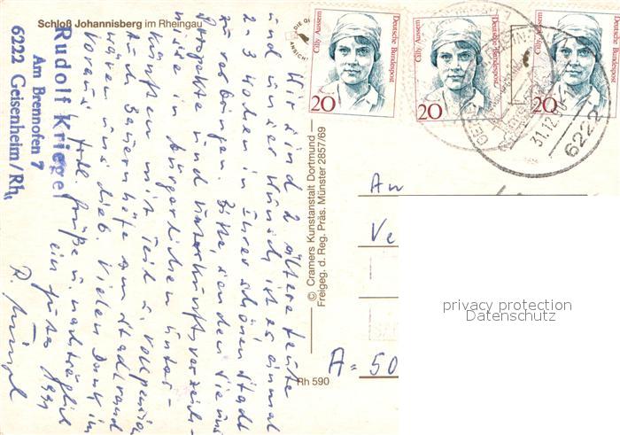 73687967 alte Postkarte Geisenheim Schloss Johannisberg im Rheingau Fliegeraufnahme postalisch gelaufen Erhaltung siehe scans [WerneD78] KatCode: 11110006439004