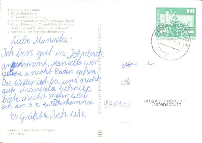 72279796 alte Postkarte Geising Erzgebirge Bergstrasse Baerenburg HO Hotel Gaststaette Kipsdorf Altenberger Steige Altenberg Platz des Bergmanns postalisch gelaufen Erhaltung siehe scans KatCode: 11110014290140