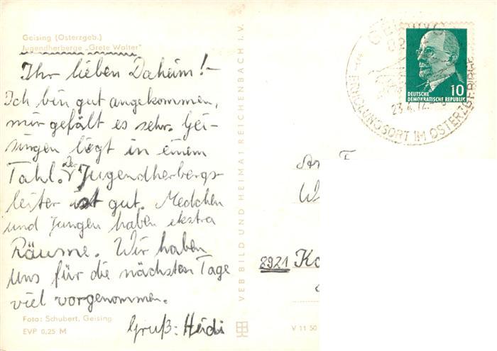 73912147 alte Postkarte Geising Erzgebirge Jugendherberge Grete Walter postalisch gelaufen Erhaltung siehe scans [WerneD78] KatCode: 11110014290140