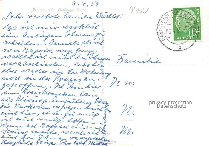 74019472 alte Postkarte Geislingen Steige Fuenftaelerstadt Fliegeraufnahme postalisch gelaufen Erhaltung siehe scans [WerneD78] KatCode: 11110008117024