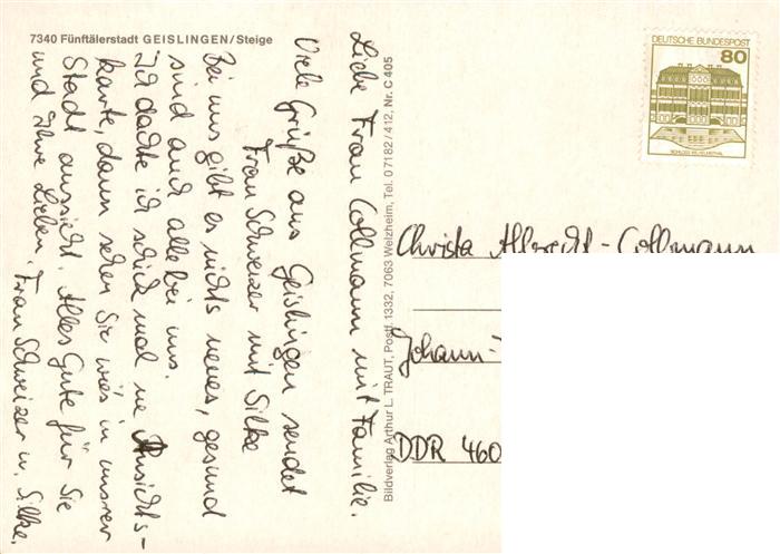 73877798 alte Postkarte Geislingen Steige Odenturm Rohrbach Wilhelms Denkmal Helfenstein Alter Bau WMF Ostland Kreuz Steige postalisch gelaufen Erhaltung siehe scans [WerneD78] KatCode: 11110008117024