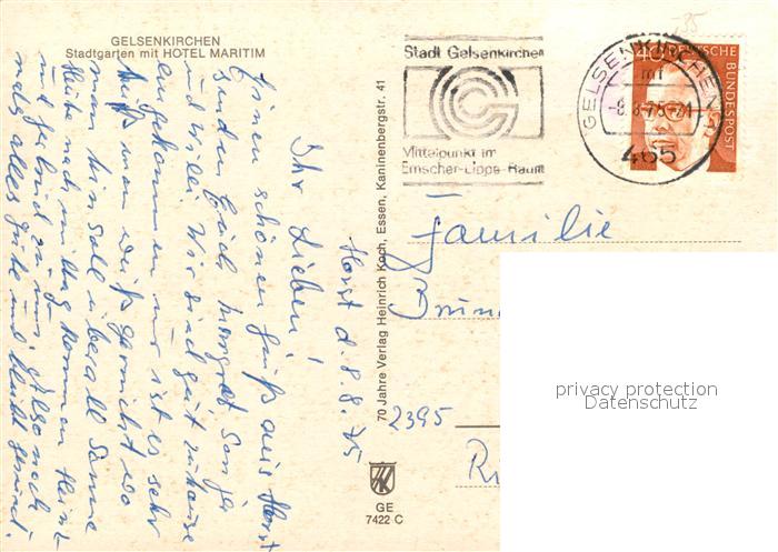 73097899 alte Postkarte GELSENKIRCHEN NRW Stadtgarten mit Hotel Maritim postalisch gelaufen Erhaltung siehe scans [WerneD78] KatCode: 11110005513000